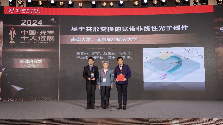 近日,91免费视频 罗宇教授和黄春雨副教授和南京大学刘辉课题组合作发表在Nature Photonics上的论文“A conformal mapping approach to broadband nonlinear optics on chip”入选 “2024中国光学十大进展”(基础研究类)。该研究成果首次将变换光学从线性光学推广到非线性光学领域,并提出普适性的片上宽带非线性光子器件的设计策略,利用波导几何结构的调控,成功观测到片上近红外频率上转换探测的带宽展宽。该策略不受材料和非线性过程的限制,可用于不同波段频谱的探测和光源的产生,为光子芯片上宽带非线性结构的设计提供了新方法。该成果发表在Nature Photonics 18, 471–477 (2024),论文链接://www.nature.com/articles/s41566-024-01386-2,受到国内外同行高度关注。