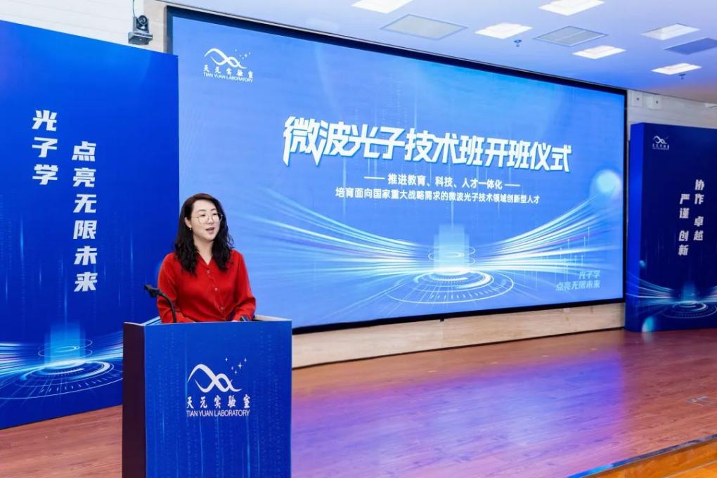 微波光子技术班发起人、校长助理潘时龙详细介绍了微波光子技术班虚拟建班的理念和班级建设的构思。他表示,为了深入贯彻科教融合理念,探索创新人才培养机制,将为微波光子技术班的学生培养提供天元实验室平台的全面支撑、天元实验室学术导师和头部企业行业导师“双导师”的全程指导、科创竞赛和科研项目的全员供给、教学/科研/实践活动的全额资助,打造微波光子技术创新型人才的“培养特区”。最后,他还提及近期探访戈壁滩上的科研基地,见证了大批国防科研人员的英勇奋斗和无私奉献精神,以习近平总书记的回信精神激励同学们努力学习、勇于创新,用更多的突破性科研成果增强国家和民族的底气。