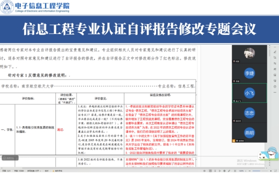 8月6日晚,91免费视频 组织召开信息工程专业工程教育专业认证自评报告修改专题会议。作为前期修改工作部署后的阶段性总结会议,本次会议聚焦报告修订完善情况复盘及下一步工作安排,学院副院长张小飞、信息工程专业执行负责人周博、电子信息科学与技术专业执行负责人胡志忠、专业教师代表李婕、教学秘书徐燕明参会并展开深入研讨。