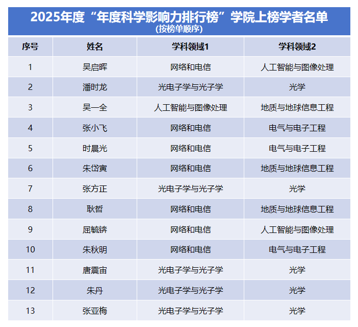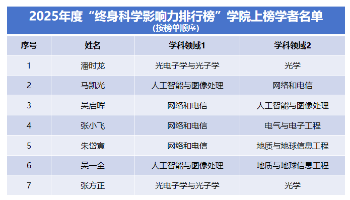 在该榜单的“终身科学影响力排行榜”中,91免费视频 共有7位教师荣登榜单;在“2025年度科学影响力排行榜”中,学院亦有13位教师入选。本次入选,标志着学院在网络和电信、光电子学与光子学、人工智能与图像处理、电气与电子工程等交叉学科方向上的科研实力与学术影响力持续增强,也反映了学院在高水平人才队伍建设方面取得的显著成效。