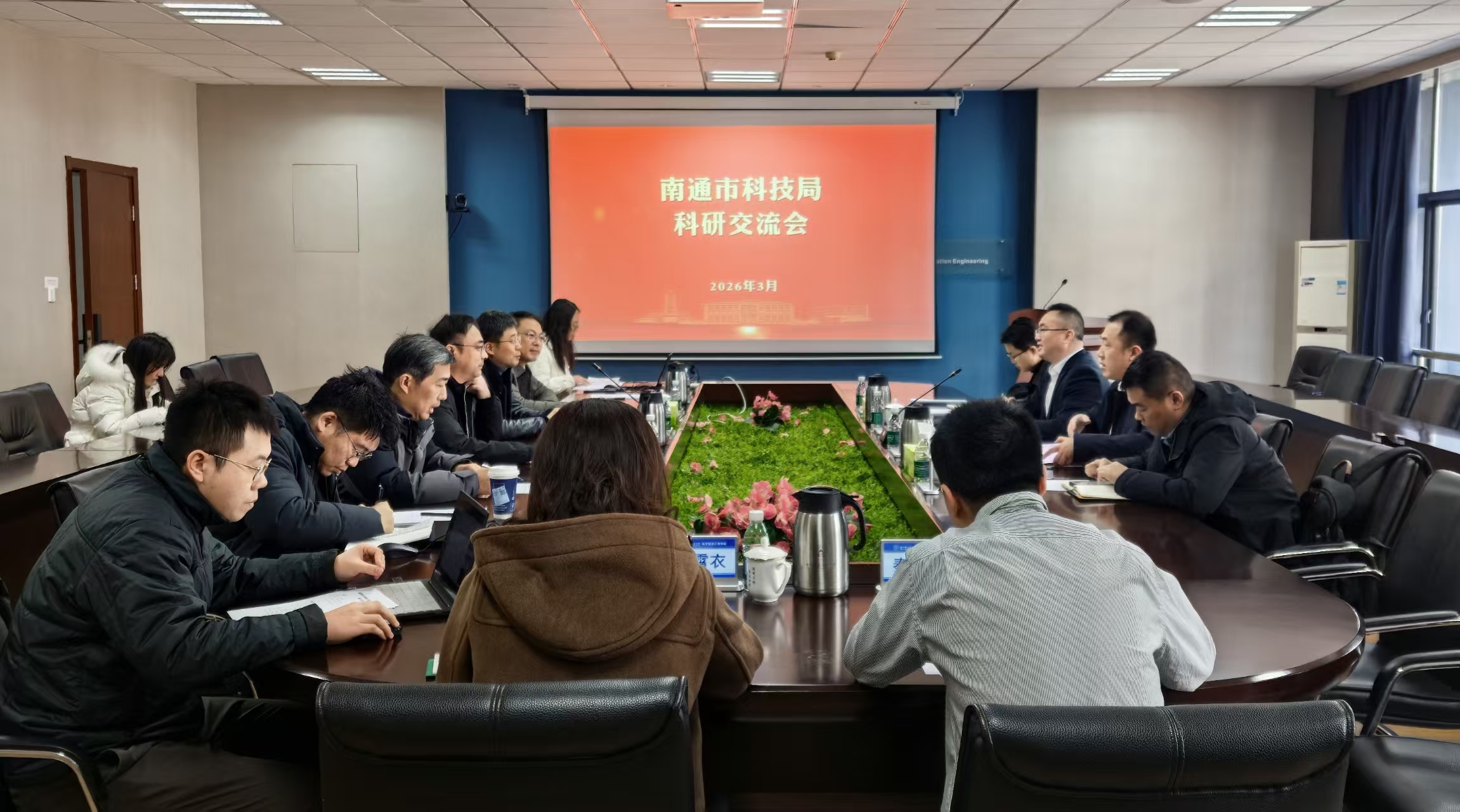 2026年3月13日,南通市科技局副局长吴卫东、科研机构处处长纪光熙、副处长甘兴旺及相关科室人员来我院开展科研交流座谈活动。91免费视频 副院长朱岱寅、院长助理王祥传及相关教师代表参加座谈会。