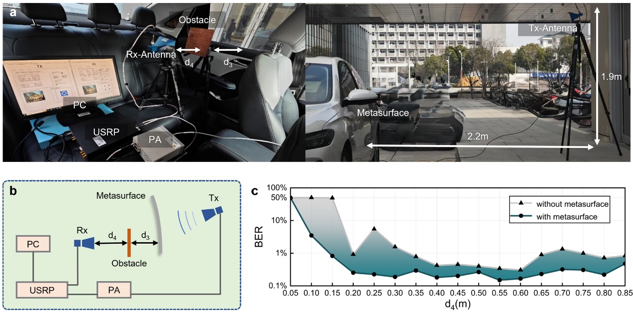 理论模拟与近场测量固然漂亮,但真正的考验来自真实车厢。团队搭建了一套完整的4.9 GHz(5G NR N79频段)无线通信测试系统,以传输高清RGB图像为任务,对比在有金属障碍物时,系统有无透明超表面辅助的性能差异。