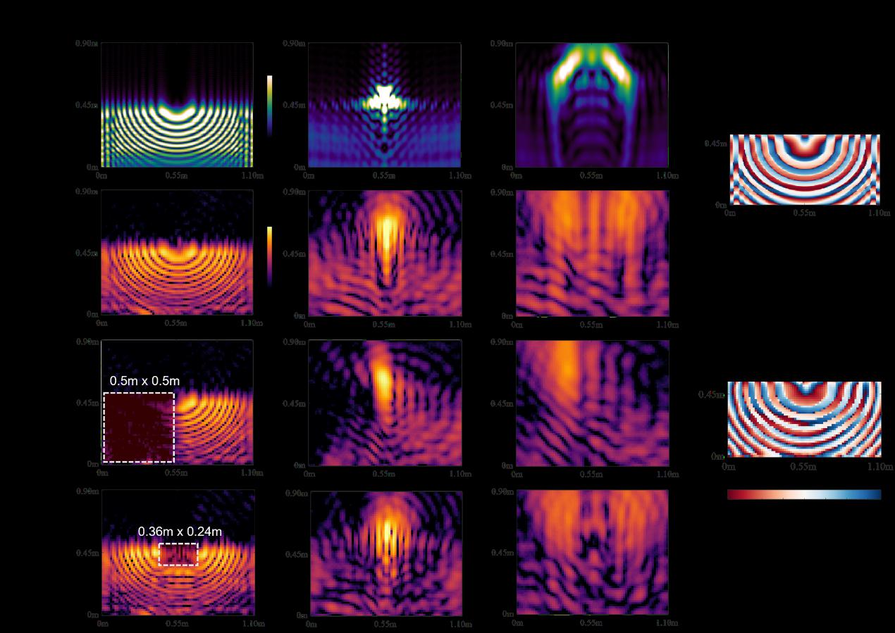 用于侧窗的正交韦伯波(OWB): 考虑到乘客手持设备通常位于侧窗的后下方,该波束在水平(x)和垂直(y)方向分别设计成具有加速特性。从侧窗发出的电磁波会自动向下并向车后方弯曲,精准覆盖乘客所在区域。近场测量显示,即便将一个150毫米见方的金属块完全遮挡波束主瓣,波束在传播0.6米后依然能通过旁瓣干涉实现自我修复,恢复稳定的能量输送。