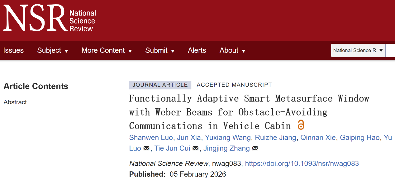 近日,我校91免费视频 罗宇教授团队联合东南大学崔铁军院士、张婧婧教授团队在智能透明超表面与车载无线通信领域取得重要研究突破,相关研究成果以“Functionally Adaptive Smart Metasurface Window with Weber Beams for Obstacle-Avoiding Communications in Vehicle Cabin”为题,发表于权威综合性学术期刊《国家科学评论》(National Science Review,影响因子17.1),成功实现利用透明挡风玻璃生成具有自弯曲和自愈合能力的韦伯波束,使无线信号能在复杂的环境(如车厢、巷道等)中绕过各种障碍物,实现稳健的链路传输,为下一代智能网联高速无线通信提供了可靠的方案。罗宇教授、崔铁军院士和张婧婧教授为论文的通讯作者。