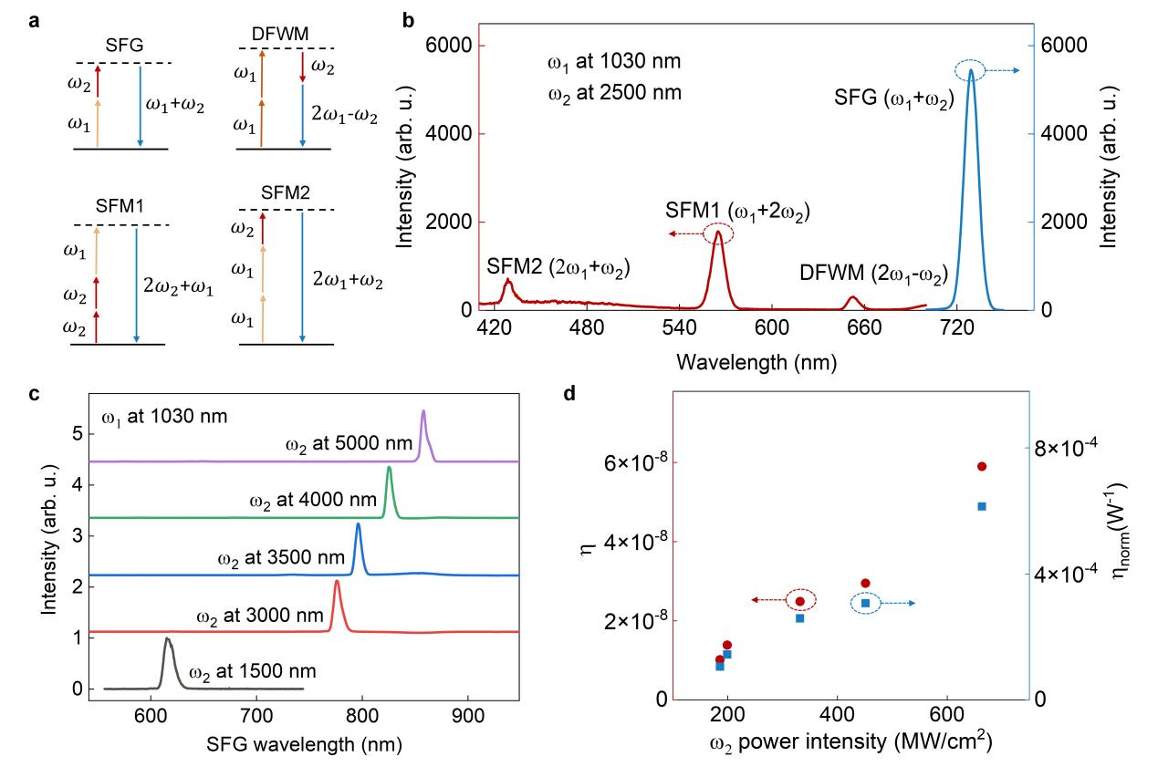 图4 NbOI₂晶体中用于中红外频率上转换的频率混频。
