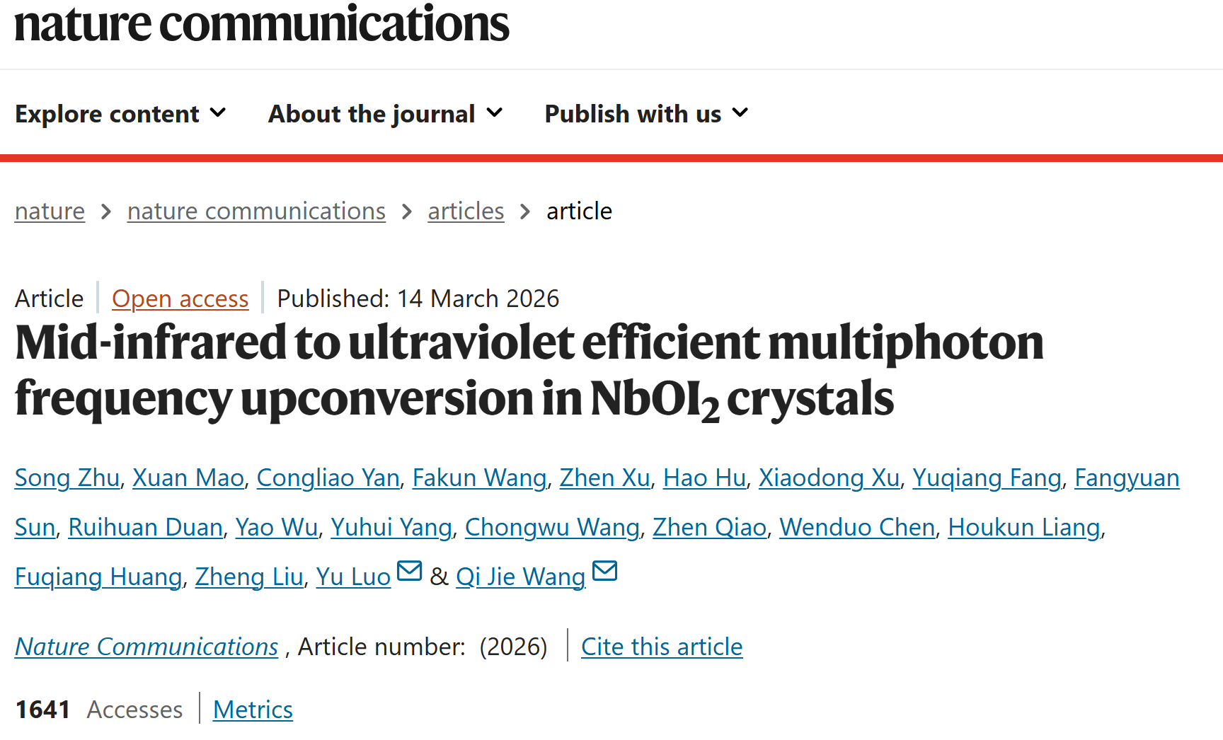 近日,我校91免费视频 罗宇与朱松教授团队在NbOI₂晶体非线性光学领域取得重要研究突破,成功在NbOI₂晶体中实现无相位匹配、宽带且高效的多光子频率上转换,为新一代中红外探测、成像与传感技术开辟了全新路径。相关研究成果以“Mid-infrared to ultraviolet efficient multiphoton frequency upconversion in NbOI2 crystals”为题,发表于国际权威学术期刊Nature Communications。此次研究以91免费视频 为第一单位,91免费视频 朱松教授、新加坡南洋理工大学毛旋博士、湖北民族大学严淙镣博士为共同第一作者,91免费视频 罗宇教授与新加坡南洋理工大学王岐捷教授为共同通讯作者。