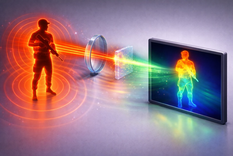 中红外成像作为捕捉分子“指纹光谱”的核心技术,在生物医学、环境监测、安防检测及国防安全等关键领域具有不可替代的战略意义——它可实现生物组织深层无损成像、环境有害气体精准监测、隐蔽目标红外识别等核心需求,是推动相关领域技术升级的重要支撑。长期以来,中红外信号探测高度依赖昂贵、低温工作的专用探测器,系统复杂、成本高昂,严重制约了中红外成像技术的普及应用与产业化发展。而采用非线性频率上转换技术,将不可见的中红外信号转换为可被硅基相机直接探测的可见光,是实现低成本、高灵敏红外成像的核心路线,更是破解中红外成像技术落地难题的关键突破口。但传统非线性材料普遍面临相位匹配条件苛刻、非线性系数低、光谱带宽窄等瓶颈,难以满足实用化中红外成像的需求,成为制约中红外成像技术向低成本、宽波段、高清晰方向发展的核心桎梏。