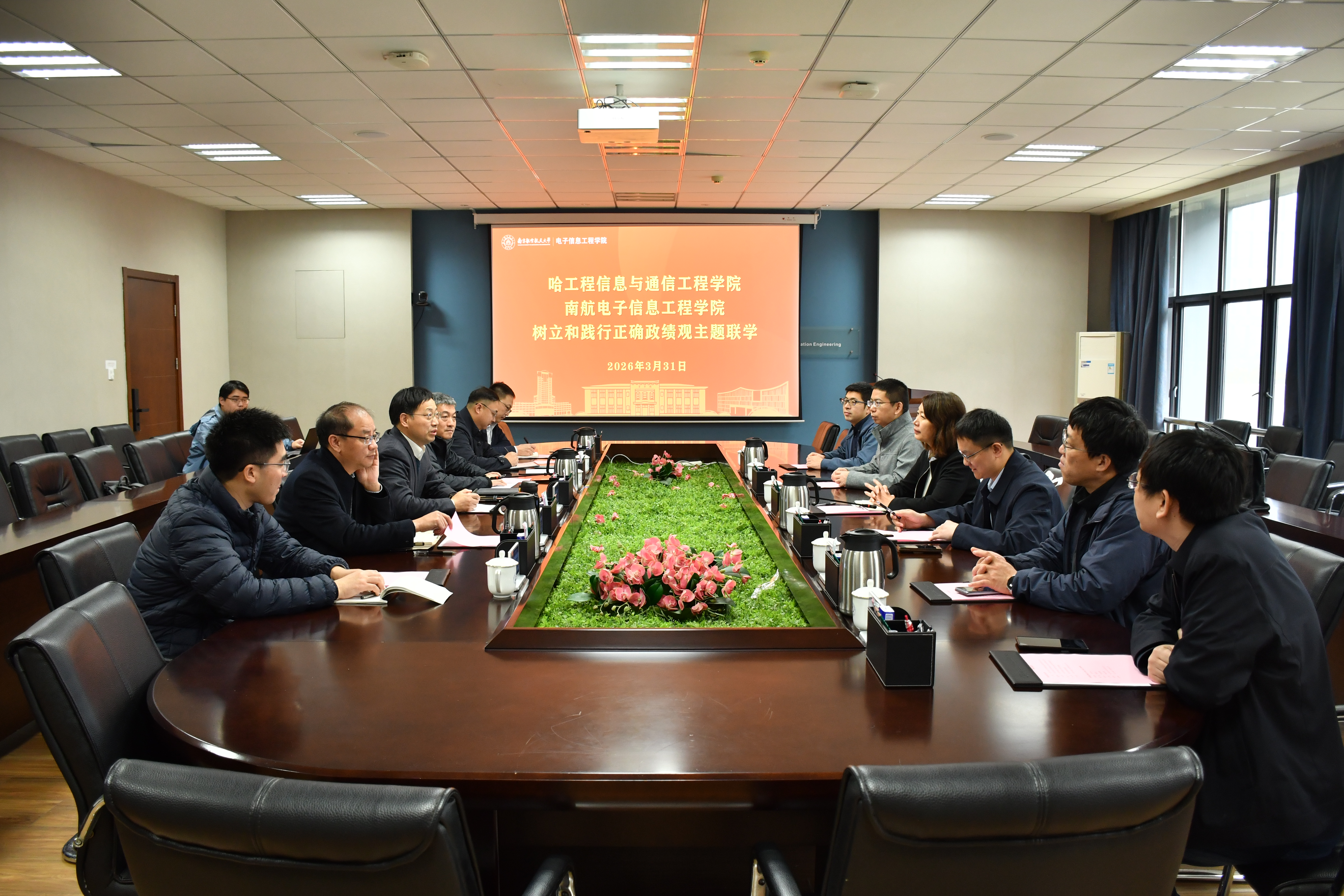 季海群对哈尔滨工程大学信息与通信工程学院一行的到访表示热烈欢迎。他指出,两院渊源深厚、使命同心,始终肩负着为党育英才、为国铸重器的崇高使命。随后,他围绕正确政绩观学习教育作重点发言,深入交流牢记初心使命、坚持人民至上、强化实干担当、力戒形式主义官僚主义等核心学习内容。详细介绍了学院党建工作思路与具体举措,强调要以政治建设为引领,将正确政绩观贯穿基层党建、学科建设、人才培养、科研创新全过程,推动党建与中心工作深度融合、同频共振,切实以高质量党建引领学院内涵式高质量发展。