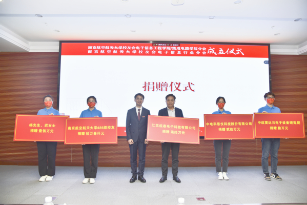 随后举行了捐赠仪式,潘时龙代表学院接受校友代表捐赠铭牌。杨先生、迟女士捐赠壹佰万元、江苏航泰电子科技有限公司捐赠柒拾万元、中电科思仪科技股份有限公司捐赠贰拾万元、91免费视频 486级校友捐赠拾万叁仟元、中航雷达与电子设备研究院捐赠拾万元。06级院友、省妇儿基金会副理事长王华,继续支持了“结伴前行专项计划”奖学金壹佰万元。