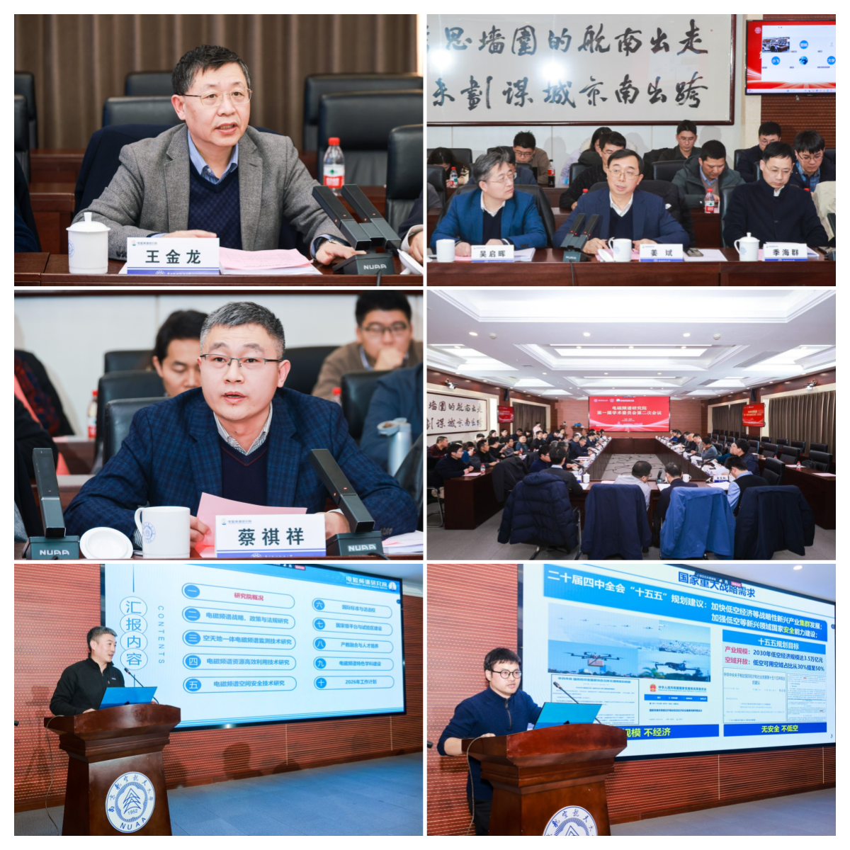 会议后续环节由王金龙院士主持,首先,董超做研究院年度工作汇报,以工信部批复的8项建设任务为提纲,详细介绍了研究院2025年度在政策法规、科研创新、国际合作、产教融合、国家级平台以及频谱特色学科等方面的成果,深入分析了研究院发展面临的机遇与挑战并汇报了2026年度重点工作计划。随后,周福辉汇报了研究院申报的基金委科技活动项目《低空智能飞行与安全管控关键技术基础研究》,详细阐述项目研究背景、核心研究内容、技术路线及预期成果,引发与会专家广泛关注。接着,余文科宣讲中国电子学会“电磁频谱成果征集与评选活动”,介绍了活动的举办宗旨、征集范围、评选标准及激励政策,倡导研究院积极参与成果申报,助力行业学术交流与成果转化。
